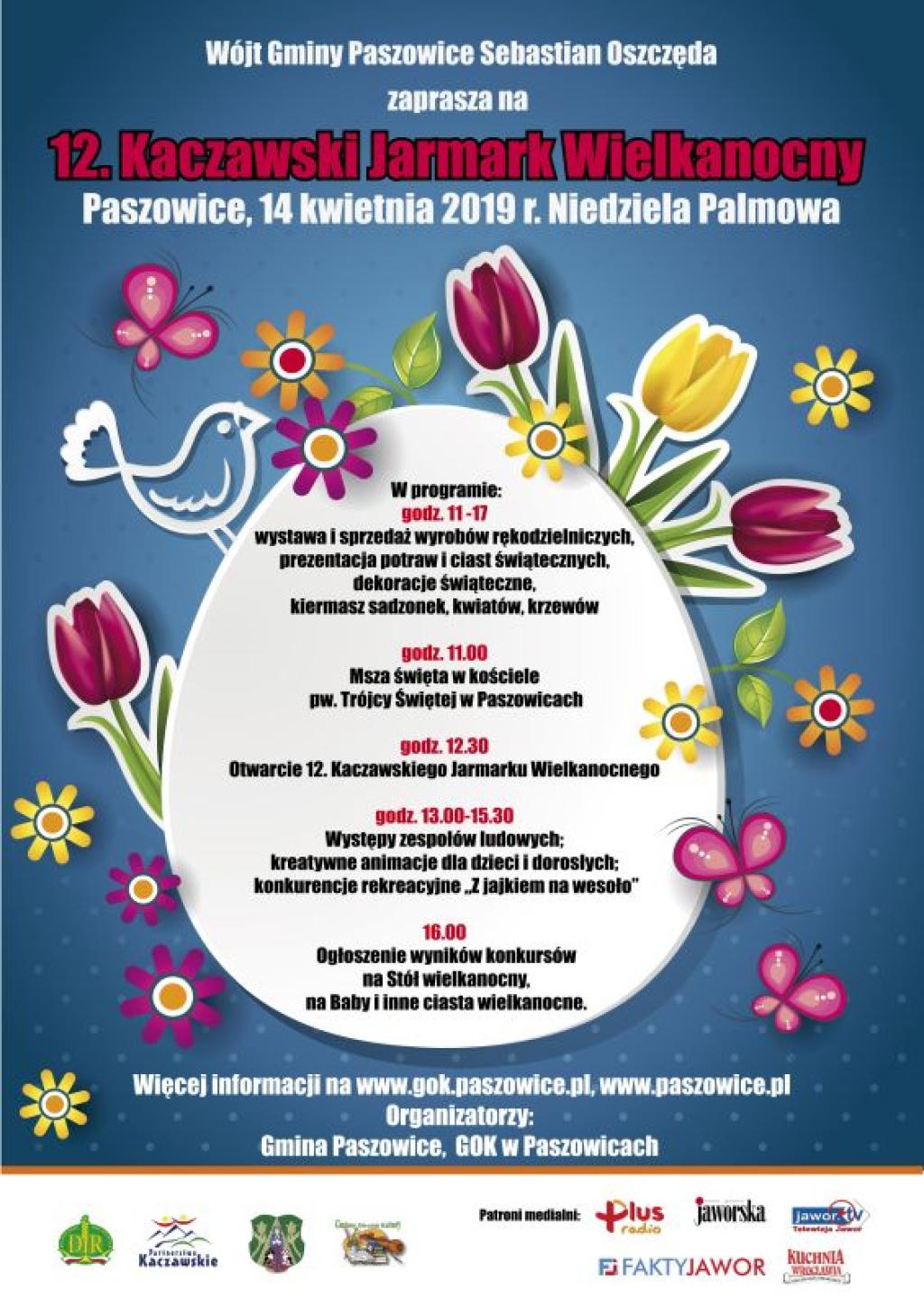 Wójt Gminy Paszowice Sebastian Oszczęda zaprasza do udziału w 12. Kaczawskim Jarmarku Wielkanocnym, który odbędzie się 14 kwietnia, w Niedzielę Palmową, w Paszowicach.