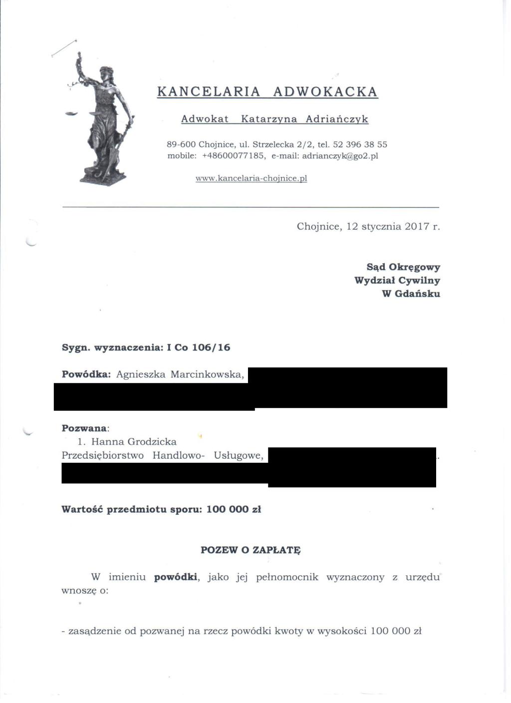 Natomiast zupełnie coś innego pisze Hanna Grodzicka w piśmie do Patriot24.net. W dokumencie, który zostanie dziś dostarczony do Sądu Rejonowego w Gdańsku, piszę że w chwili śmierci Robert Marcinkowski nie był jej pracownikiem. Czyli zaprzecza zeznaniom złożonymi przed sądem rzez jej syna, który razem z nią realizował zadania w jej firmie.