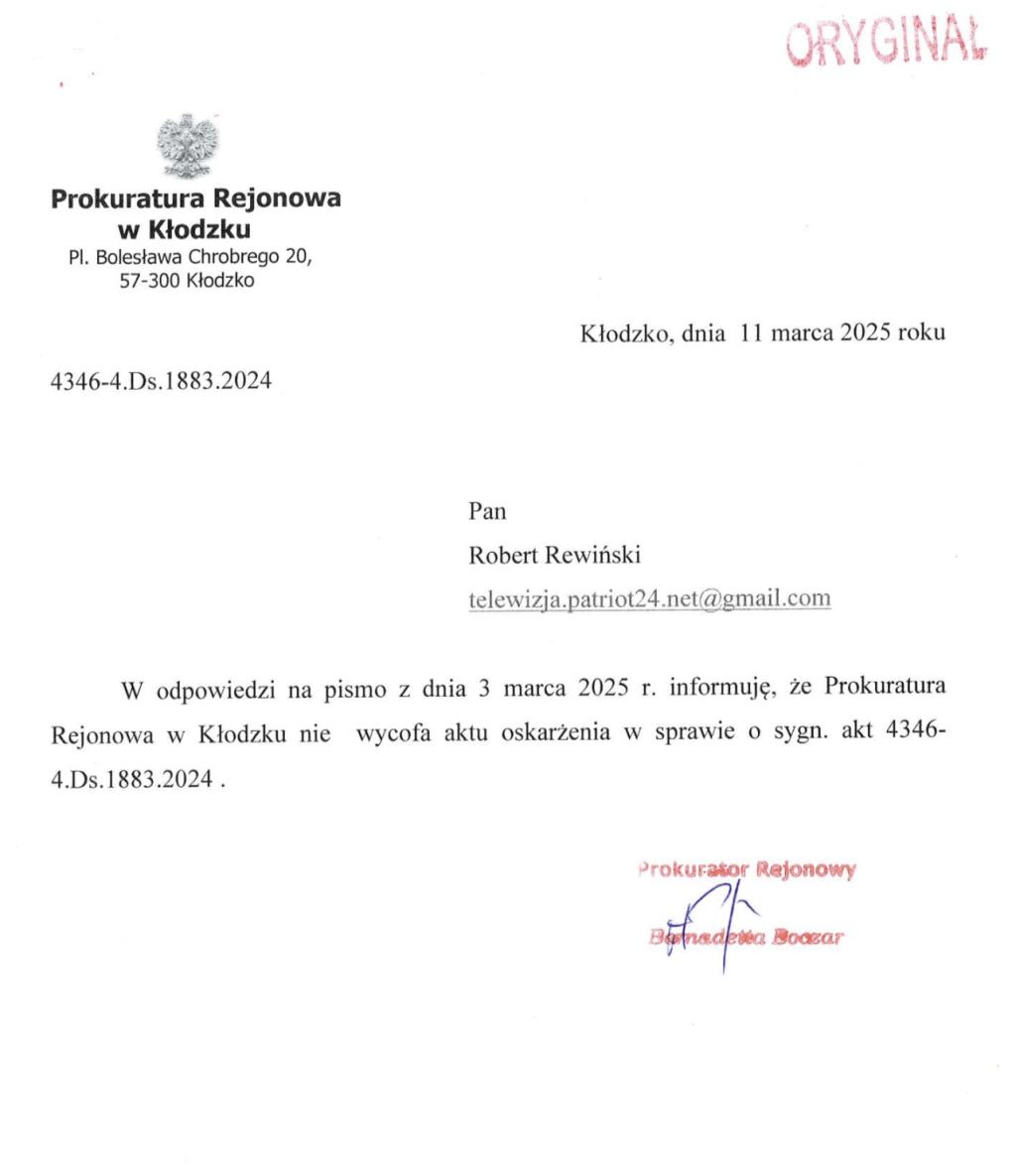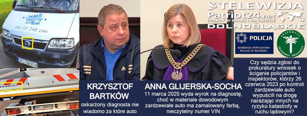 Nasza redakcja przed wczorajszym procesem pytała zarówno Prokuraturę Rejonową w Kłodzku, jak i Prokuraturę Okręgową w Świdnicy, czy wycofają ten absurdalny akt oskarżenia opierający się na zdjęciach nie wiadomo jakiego pojazdu? Ale obie instytucje uporczywie domagają się pozbawienia Krzysztofa Bartków uprawnień pracy dla profesjonalnej stacji diagnostycznej Bożeny Zalewskiej. Bo ze względu na wysoki poziom usług, ustawiają się tu kolejki. A dodatkowo za wysoką jakość sprzedaży aut importowanych z Niemiec, Bożena Zalewska otrzymała nagrodę "Złotej Podkowy" od Starosty Kłodzkiego.