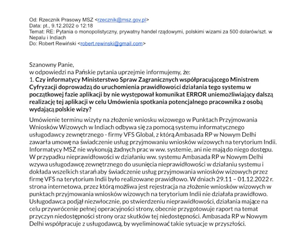 - Dlaczego Ambasador RP w Dehli wybrał nierzetelną firmę jako operatora wydawania polskich wiz pracownikom z Indii i Nepalu? Dlaczego polscy pracodawcy muszą płacić temu operatorowi 500 dolarów dodatkowo za wydanie - pyta w imieniu polskich pracodawców Robert Rewiński, Redaktor Naczelny Patriot24.net i Telewizja.Patriot24.net