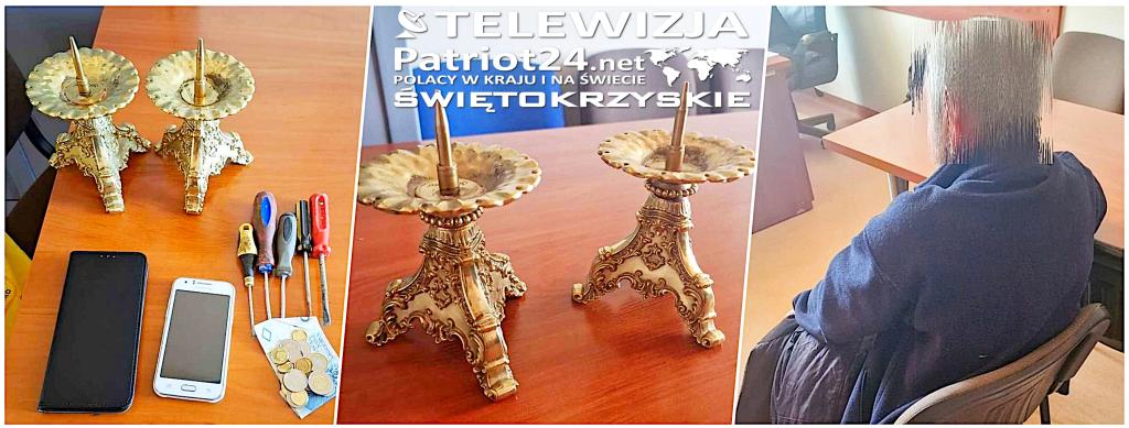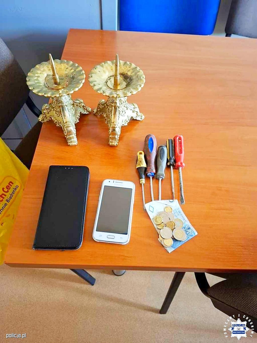 W poniedziałek rano dyżurny jednego z kieleckich komisariatów otrzymał zgłoszenie, że w kościele mieszczącym się na terenie miasta doszło do kradzieży z włamaniem. Łupem złodzieja padła gotówka znajdująca się w trzech skarbonkach oraz dwa lichtarze. Wartość utraconego mienia została oszacowana na kwotę 1600 złotych. Sprawa trafiła do policjantów zwalczających przestępczość przeciwko mieniu kieleckiej komendy, którzy po analizie zebranego materiału, już kolejnego dnia zatrzymali 45-latka.