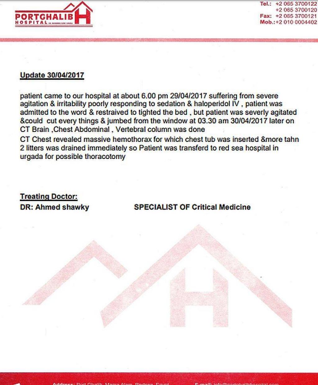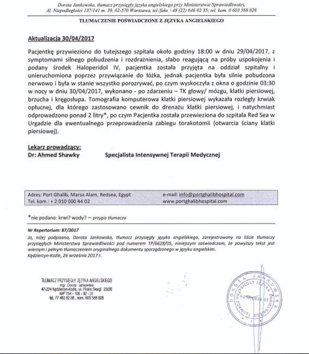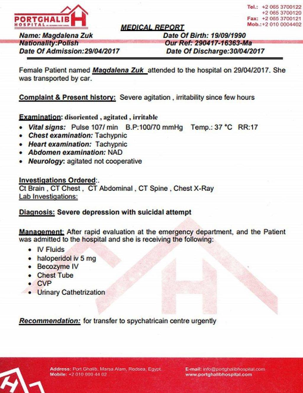 - Magdalena Żuk trafiła do pierwszego z nich 29 kwietnia o godzinie 18:00. Rozpoznano u niej silną depresję i opisano próbę samobójczą. Otrzymała silny lek antydepresyjny a lekarze zarekomendowali natychmiastowe leczenie psychiatryczne - tłumaczył Krzyszof Rutkowski, prezentując na telebimie egipskie dokumenty.