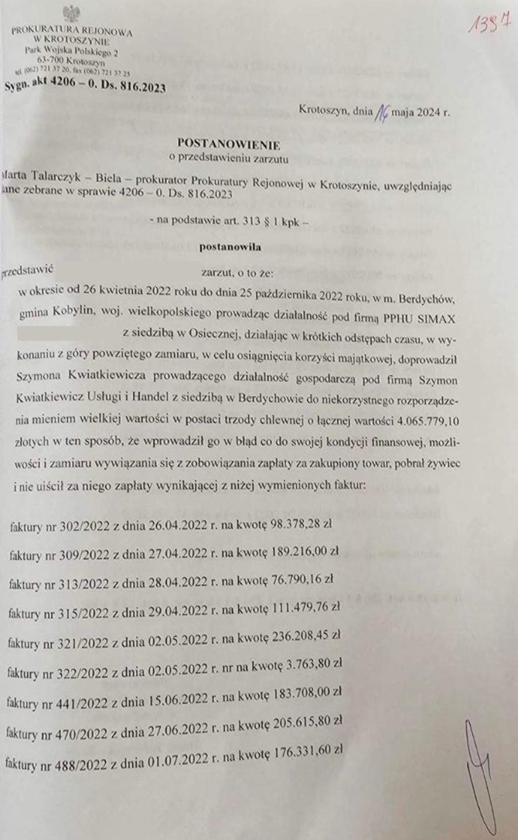 Agnieszka i Szymon Kwiatkiewicz wczoraj ujawnili iż mężczyzna który wyłudził od nich 4 mln zł ma zarzuty karne postawione przez Prokuraturę Rejonowa w Krotoszynie. Dziś te zarzuty uznał za zasadne Sąd Okręgowy w Poznaniu, odrzucił wniosek oszusta o restrukturyzację co oznacza, że będzie musiał rozliczyć się z pobranych półtusz wieprzowych. Okazuje się, że mógł też oszukać inne osoby a skala zarzutów może się w prokuraturze poszerzyć.
