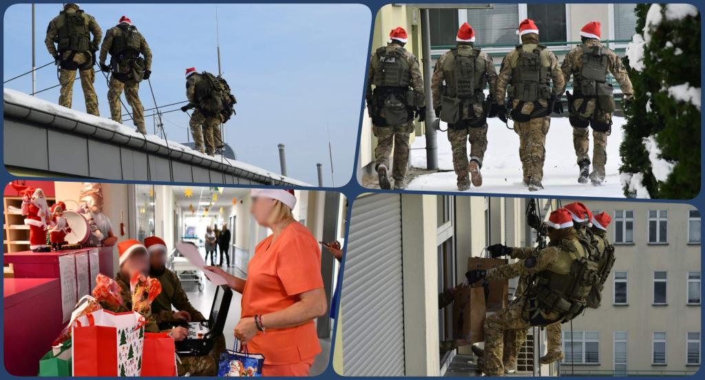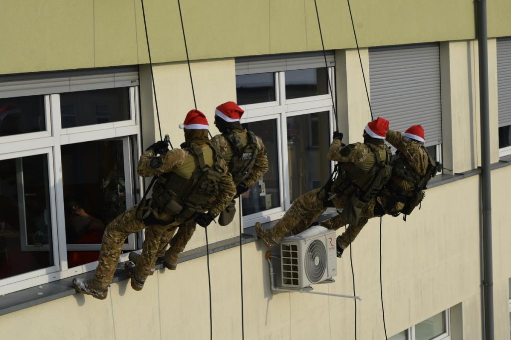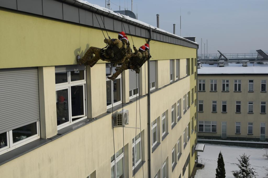 Policyjni „komandosi” mają za sobą wiele akcji, ale ta dzisiejsza była szczególna. Rzeszowscy kontrterroryści, jako pomocnicy Mikołaja, odwiedzili Kliniczny Szpital Wojewódzki Nr 2 w Rzeszowie. Zjeżdżali z dachu na linach, żeby przekazać dzieciom mikołajkowe prezenty. Pomocnikiem Mikołaja był także policyjny robot pirotechniczny, który rozdawał prezenty po szpitalnych salach.